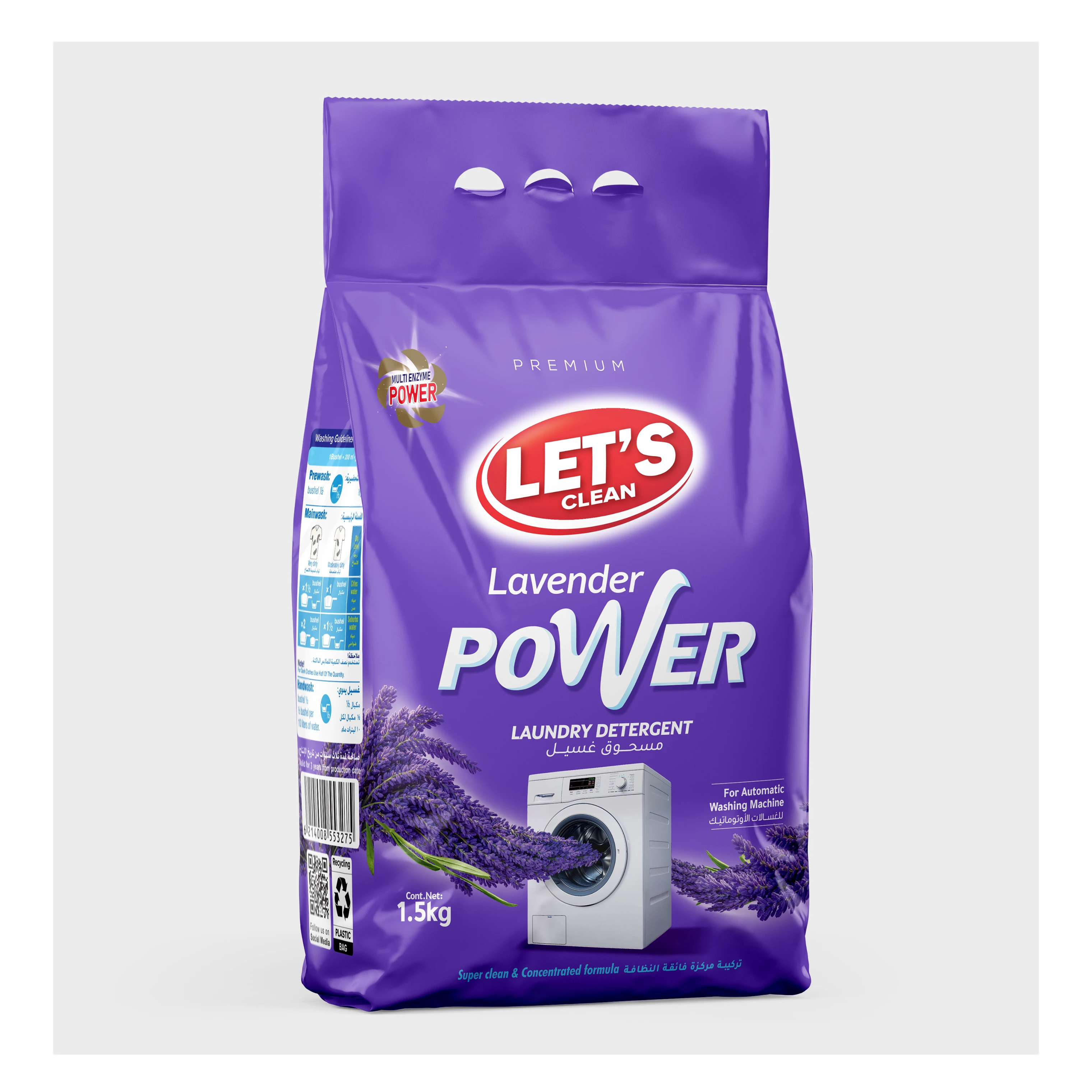 Effective and economical laundry detergent with powerful enzymes for superior stain removal. Delivers dazzling white results while leaving clothes fresh and fragrant. for a perfect laundry experience every time. Available in 2 fregrance : Red power and Lavender Power